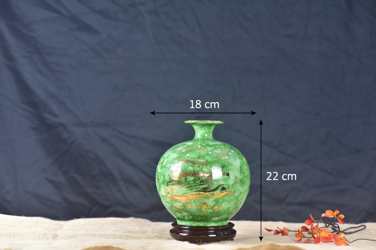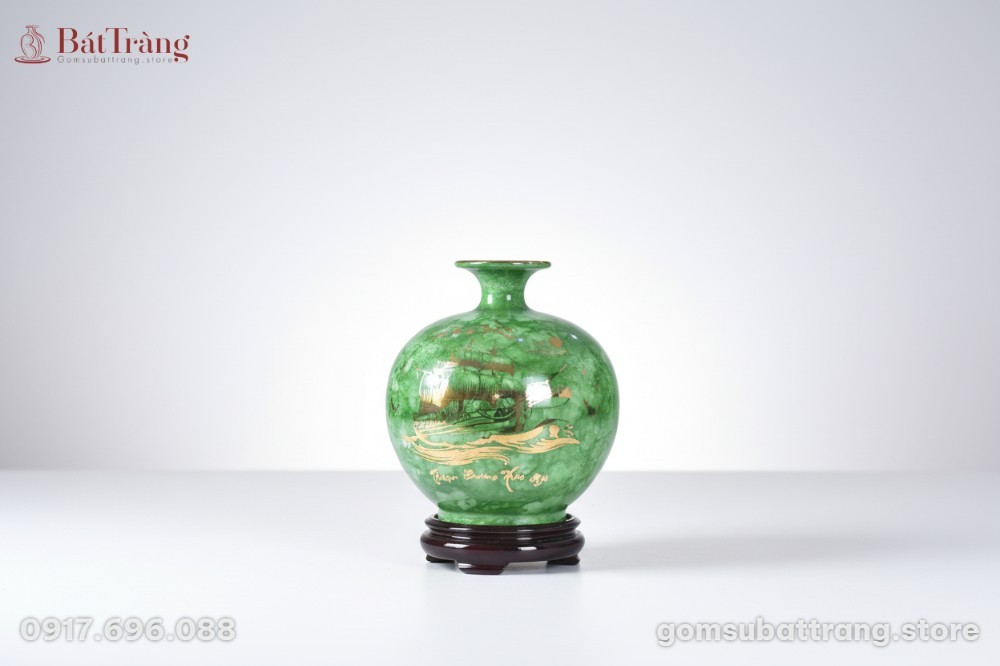 Điểm nhấn của chiếc bình là họa tiết “Thuận Buồm Xuôi Gió” được vẽ vàng thủ công đầy tinh xảo trên nền men xanh ngọc độc đáo. Họa tiết thuyền buồm căng gió vươn ra biển lớn từ lâu đã trở thành biểu tượng kinh điển trong phong thủy, tượng trưng cho mọi sự khởi đầu suôn sẻ, công việc làm ăn phát đạt và thành công viên mãn. Mỗi đường nét vẽ vàng không chỉ thể hiện sự khéo léo của người nghệ nhân mà còn mang theo ý nghĩa của sự giàu sang, phú quý.