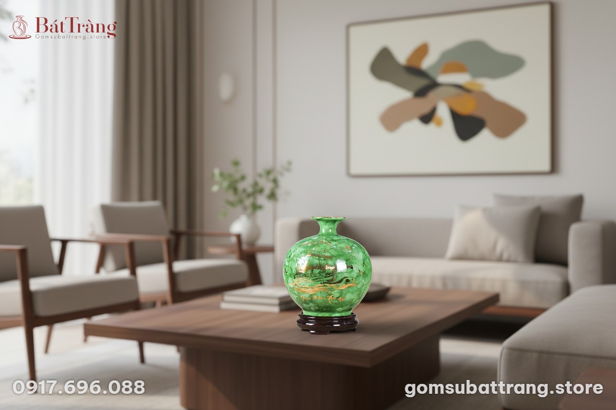 Nước men xanh ngọc chủ đạo của bình tạo nên một hiệu ứng vân đá tự nhiên, loang lổ đầy mê hoặc, khiến mỗi chiếc bình trở thành một tác phẩm độc bản. Sự kết hợp giữa màu xanh tươi mát của men và sắc vàng rực rỡ của họa tiết không chỉ mang lại vẻ đẹp sang trọng, đẳng cấp mà còn kích hoạt năng lượng sinh sôi, nảy nở, tạo ra một không gian sống tràn đầy sức sống và may mắn.