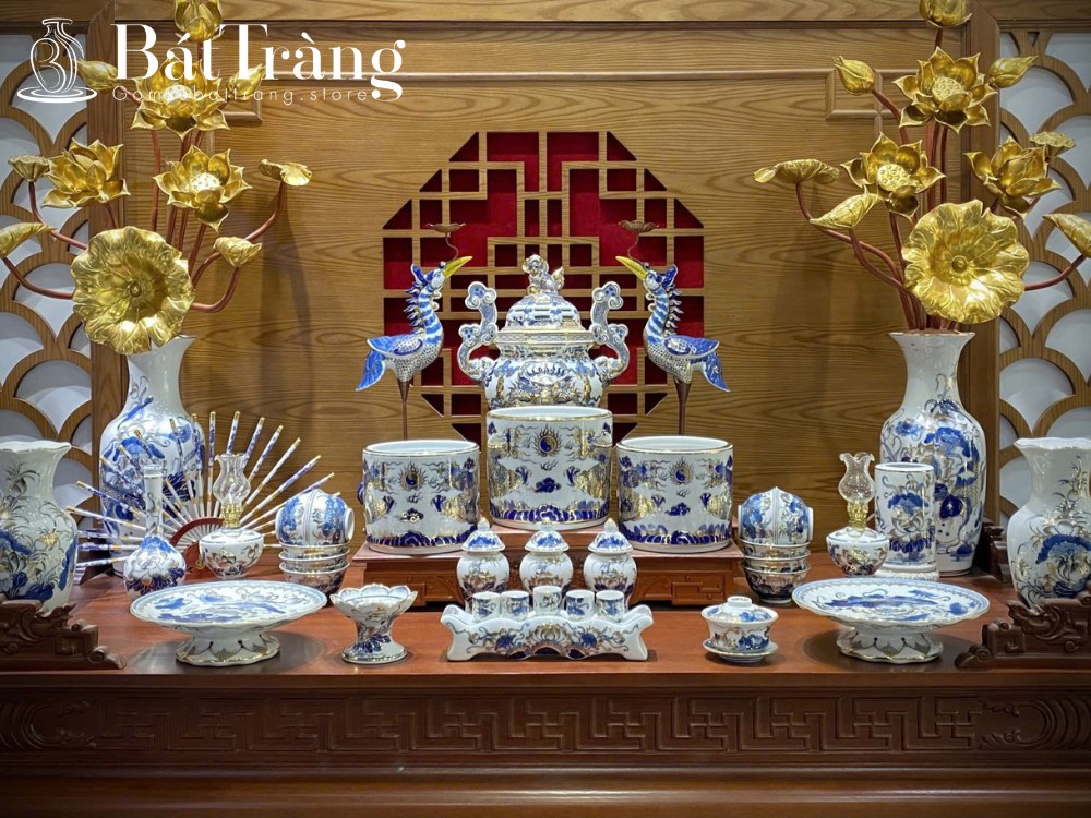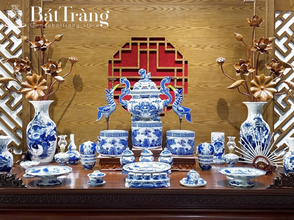 Đồ thờ men lam và men lam vẽ vàng mang lại không gian thờ thanh tịnh, ấm áp