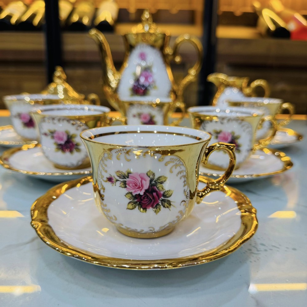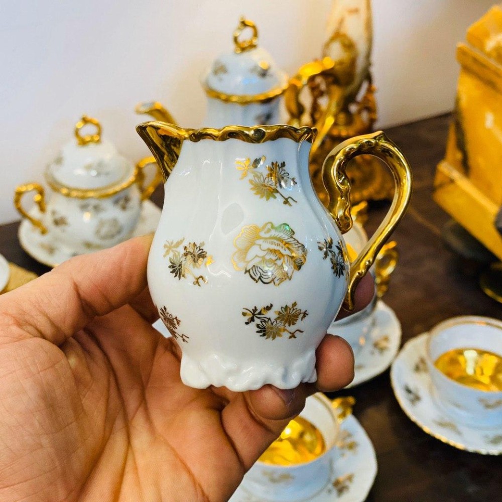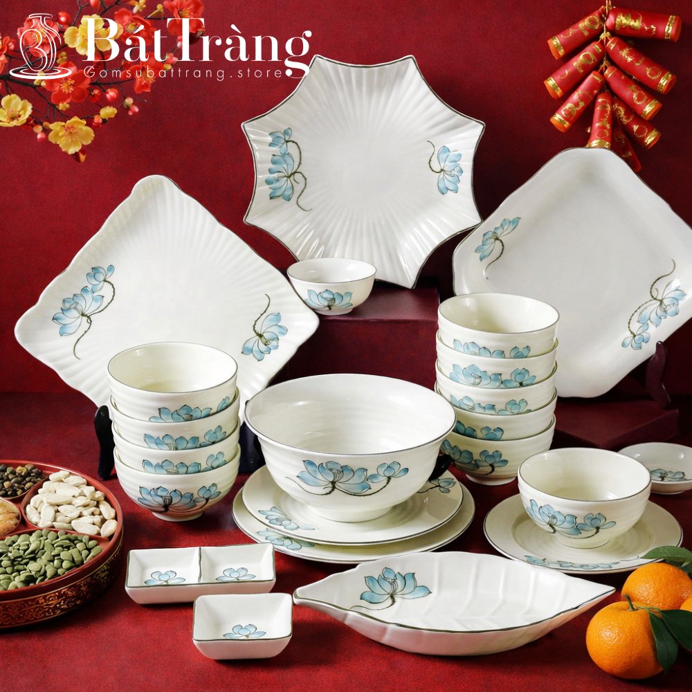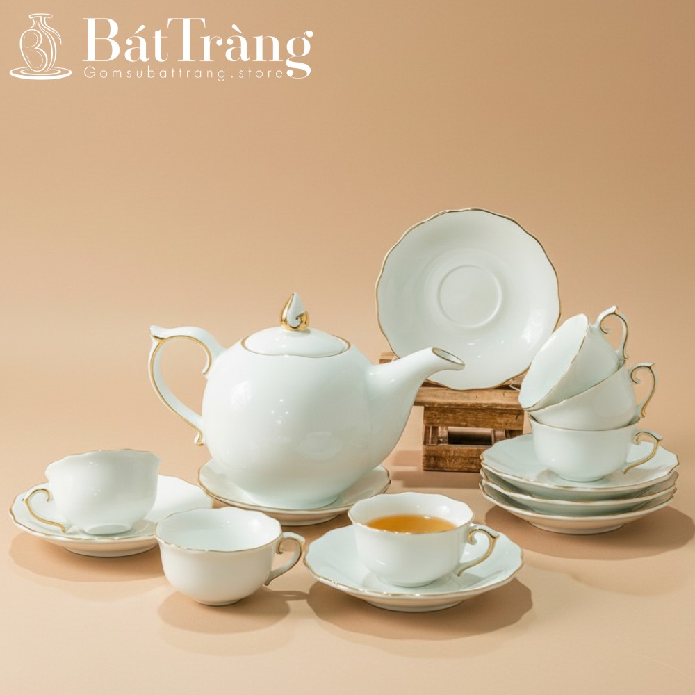 Bộ trà và bộ bát đĩa Bát Tràng sở hữu màu men sáng đẹp, họa tiết tinh tế