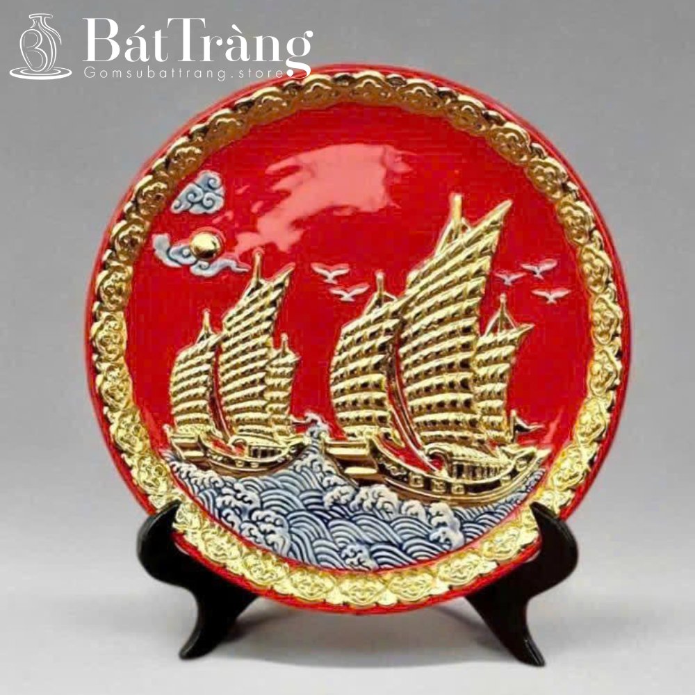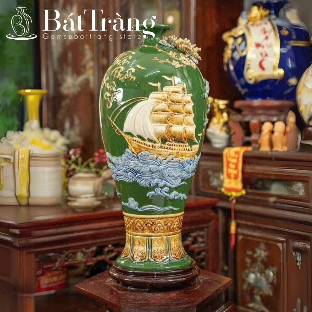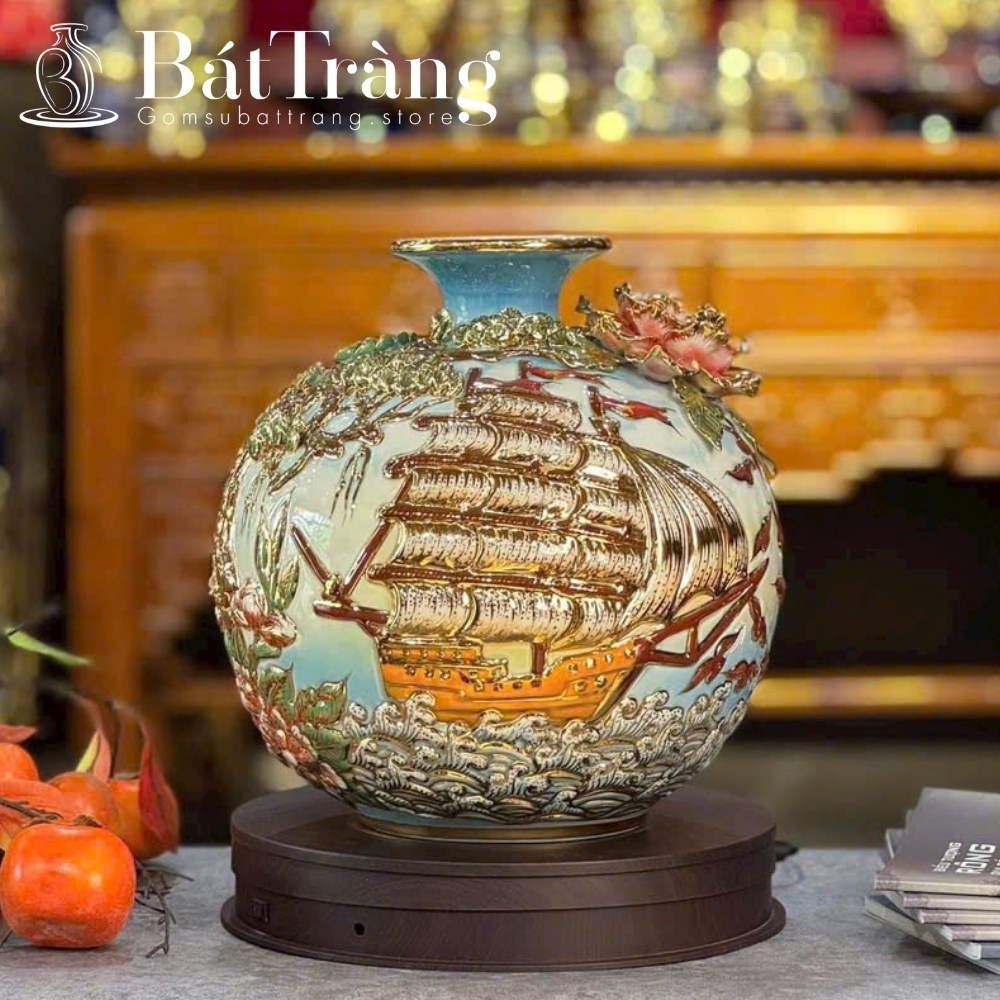 - Thuận Buồm Xuôi Gió: Hình ảnh con thuyền no gió ra khơi tượng trưng cho sự hanh thông, may mắn trong kinh doanh. Họa tiết này được ưa chuộng trên bình hút lộc, đĩa trưng bày, mai bình tích lộc,… thường được vẽ tay, đắp nổi hoặc vẽ vàng kim để tăng thêm giá trị.