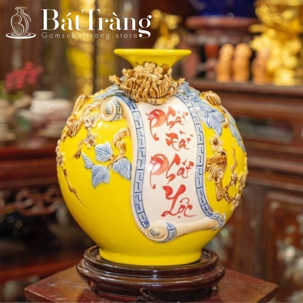 Sản phẩm đắp nổi (thường thấy ở Bình hút lộc, Lộc bình, Chóe thờ) mang lại cảm giác bề thế, uy nghi. Khi chạm tay vào, bạn cảm nhận được rõ ràng phần xương gốm gồ ghề, chắc chắn, khác hẳn sự trơn láng của gốm in decal.