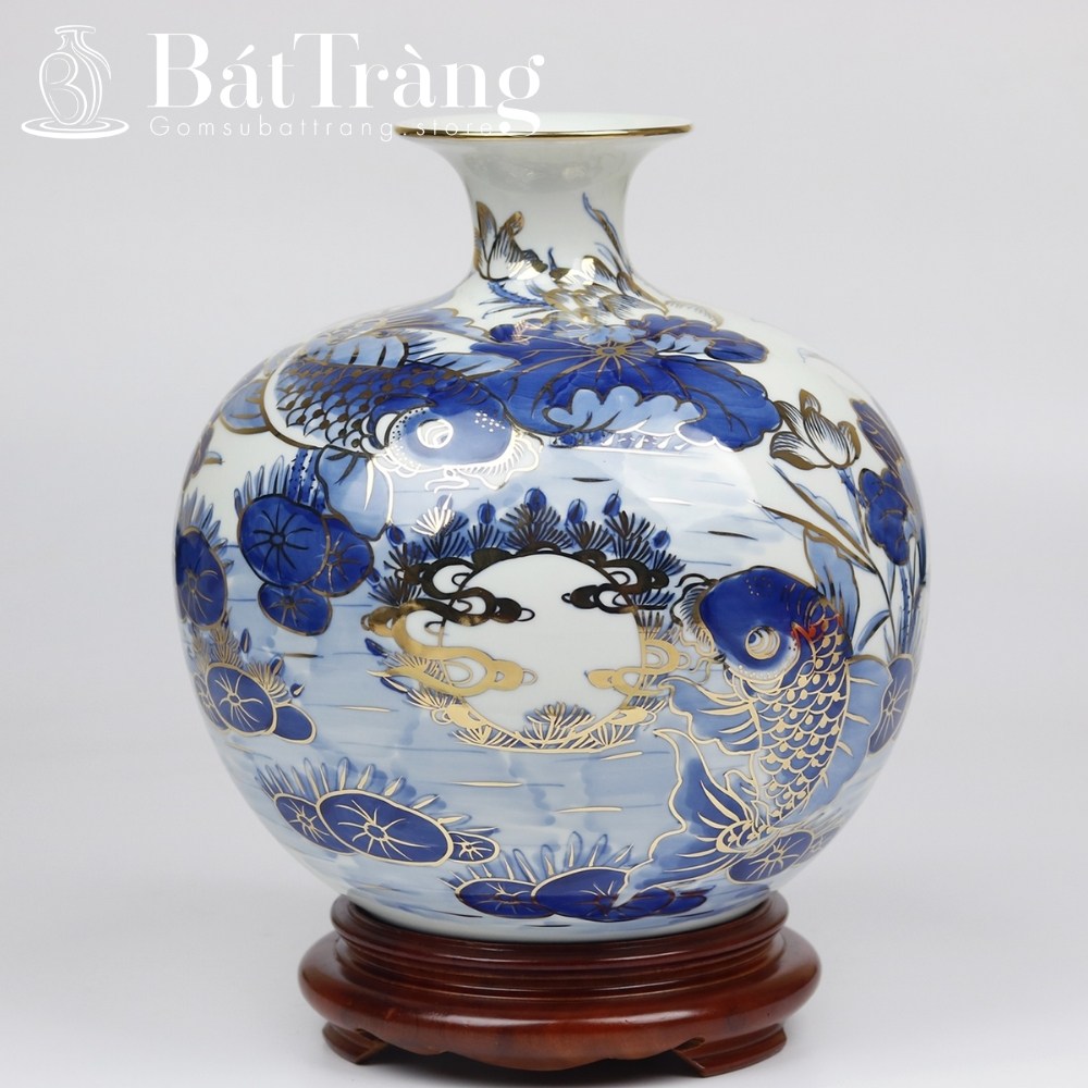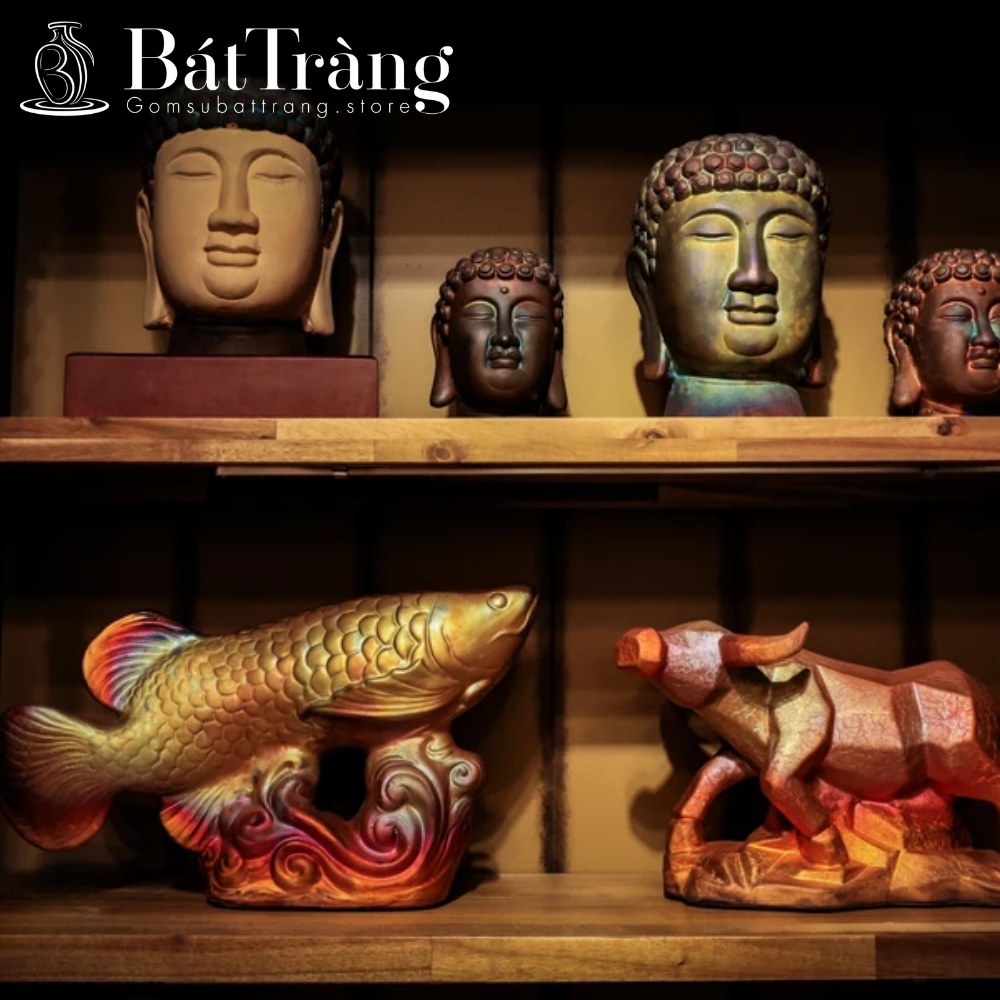 Sự hiện diện của vàng kim trên nền men lam hoặc men rạn tạo nên sự tương phản mạnh mẽ, giúp sản phẩm bắt sáng lấp lánh dưới ánh đèn. Đây là dòng sản phẩm cao cấp, thường được chọn làm quà biếu tặng VIP hoặc vật phẩm phong thủy chiêu tài lộc, thể hiện quyền uy của gia chủ.