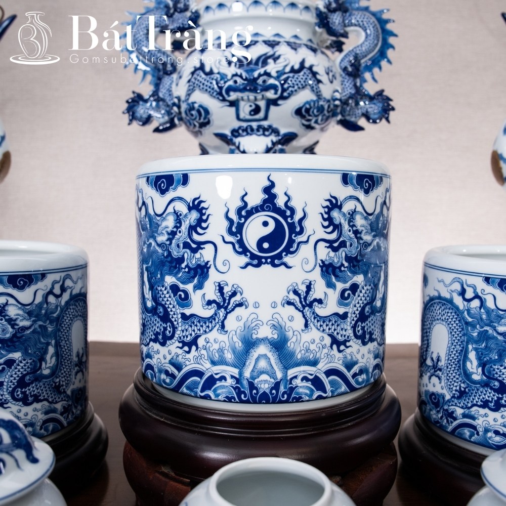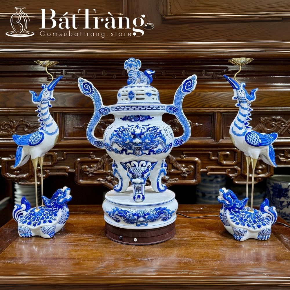 - Lưỡng lư chầu nguyệt (Rồng): Biểu tượng tối cao của quyền uy, may mắn và hạnh phúc viên mãn. Rồng Phượng thường được đắp nổi công phu hoặc vẽ tay trên các vật phẩm trang trọng như bộ đồ thờ gốm Bát Tràng.