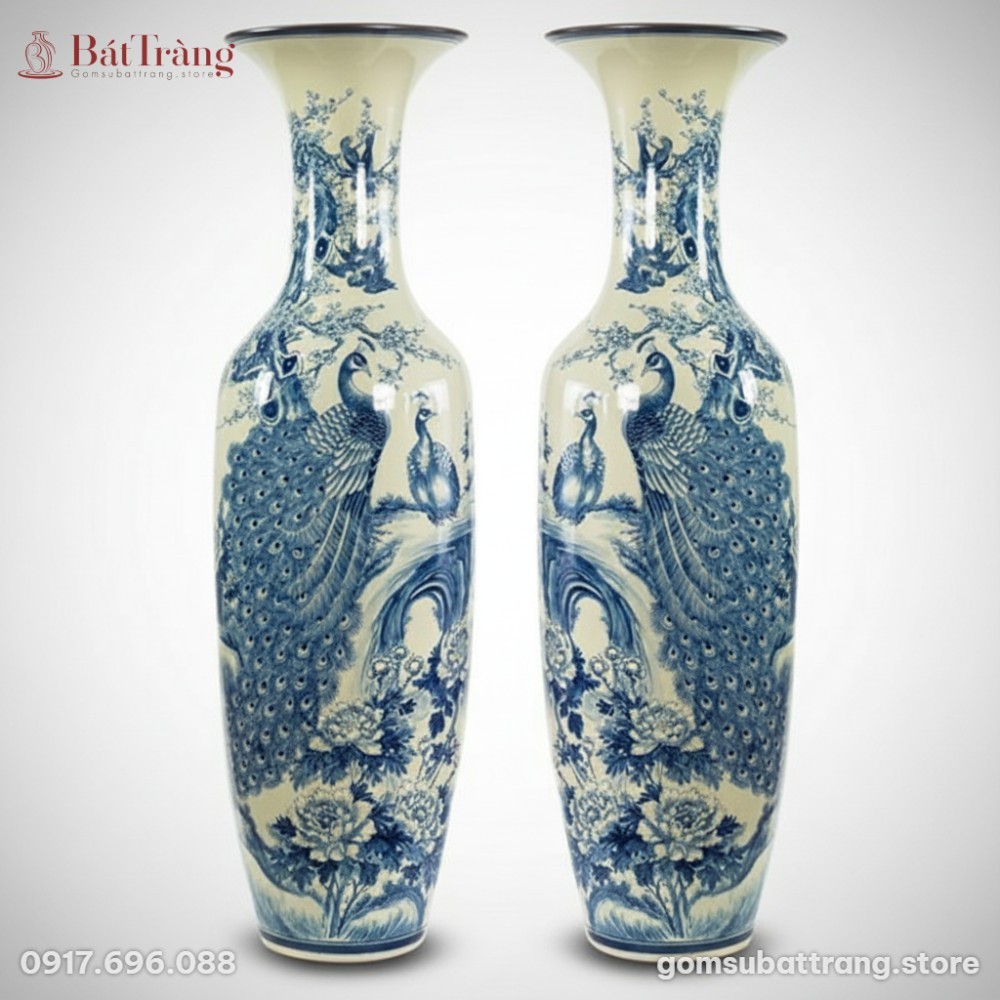 Cặp Lộc Bình Khổng Tước Bách Hoa Xanh Lam, biểu tượng của phú quý và may mắn.