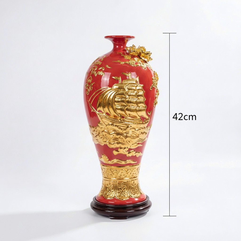 Chiếc mai bình này chắt lọc tinh hoa từ những giá trị văn hóa truyền thống, thể hiện rõ nét qua từng chi tiết. Họa tiết “Thuận Buồm Xuôi Gió” được khắc họa sống động với hình ảnh con thuyền căng buồm lướt sóng, mang theo ước vọng về một hành trình kinh doanh suôn sẻ, gặt hái nhiều thành công và tài lộc dồi dào. Không chỉ dừng lại ở ý nghĩa biểu tượng, sự kết hợp giữa men đỏ son bóng bẩy và vàng 24K dát nổi còn tạo nên một tổng thể vô cùng bắt mắt và quyền quý.