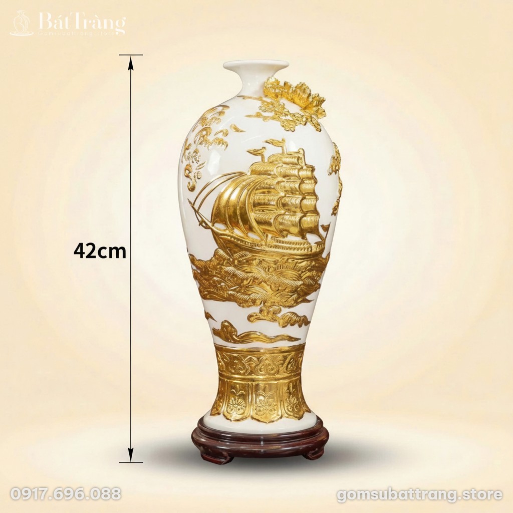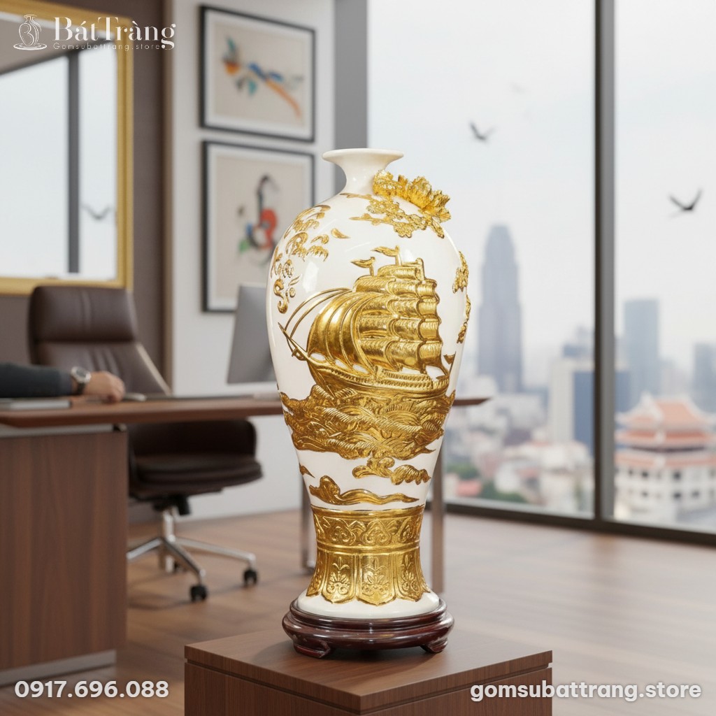 Mai bình Thuận Buồm Xuôi Gió dát vàng màu trắng BT-MB02 là một kiệt tác gốm sứ độc bản, hội tụ tinh hoa của nghệ thuật chế tác thủ công Bát Tràng và ý nghĩa phong thủy sâu sắc.