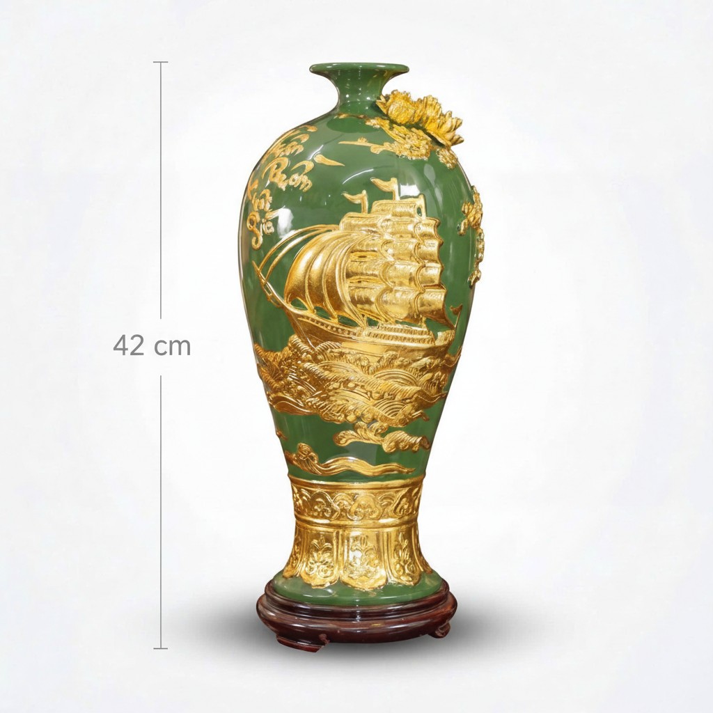Mai bình Thuận Buồm Xuôi Gió dát vàng màu xanh lá ST-MB04 là một tuyệt tác nghệ thuật, hội tụ tinh hoa chế tác gốm sứ Bát Tràng và ý nghĩa phong thủy sâu sắc.