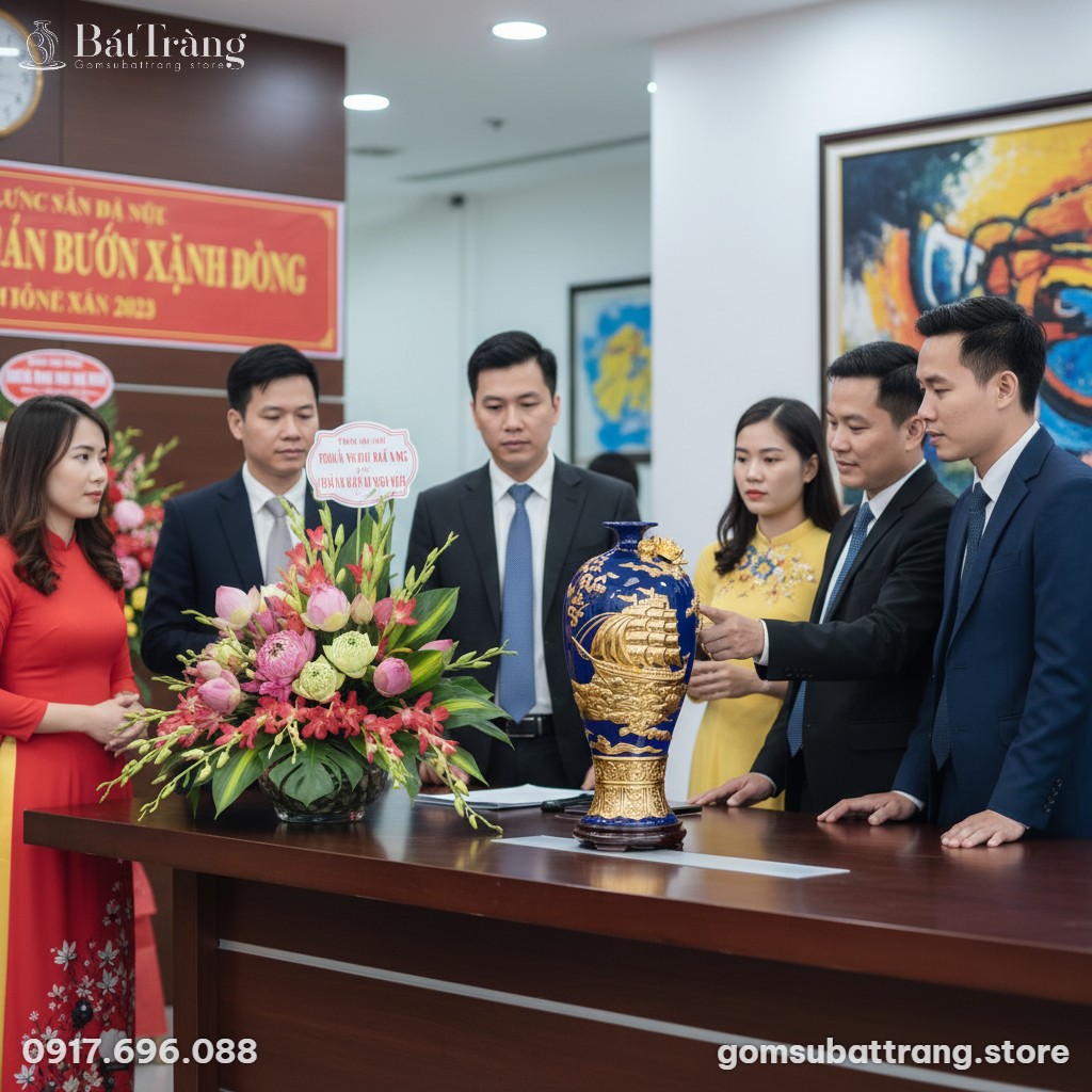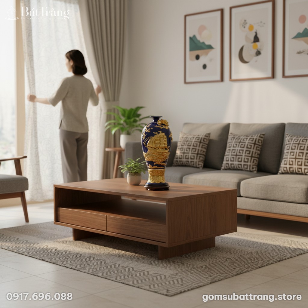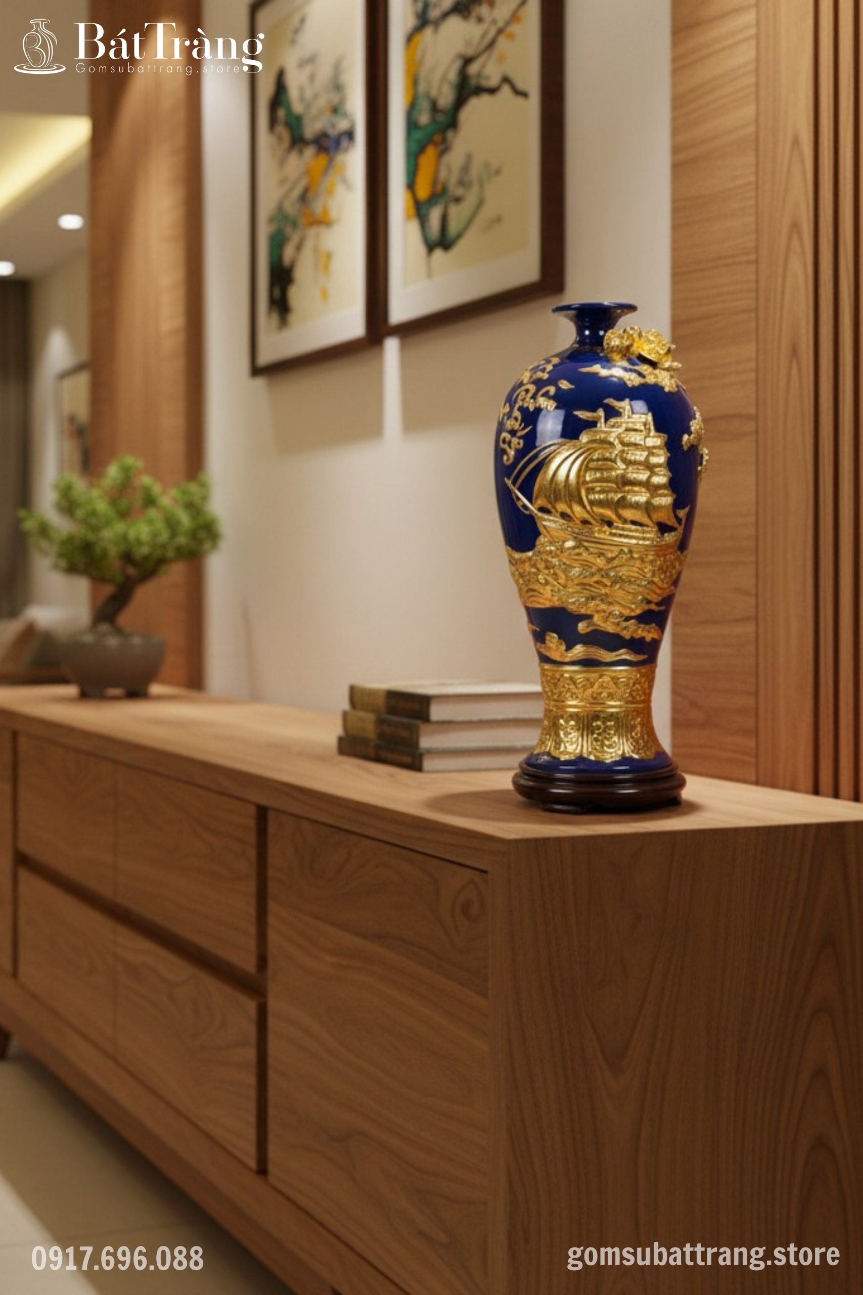 Mai bình Thuận Buồm Xuôi Gió dát vàng ST-MB01 là tuyệt tác gốm sứ Bát Tràng cao cấp, kết hợp men xanh coban và họa tiết thuyền buồm, rồng vàng đắp nổi tinh xảo. Biểu tượng của sự hanh thông, thịnh vượng, mang đến tài lộc và đẳng cấp cho không gian sống hoặc làm quà tặng ý nghĩa.