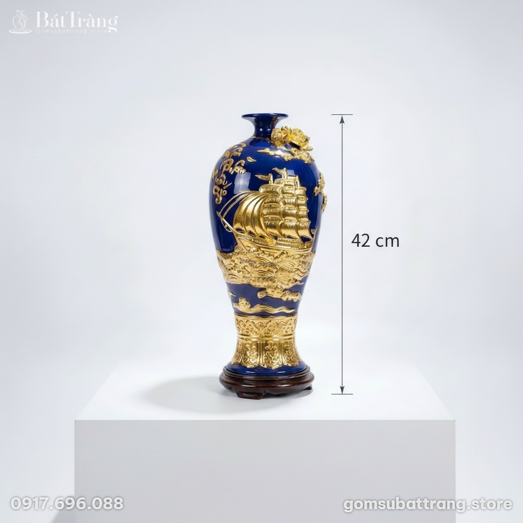 Mai bình Thuận Buồm Xuôi Gió dát vàng màu xanh coban ST-MB01
