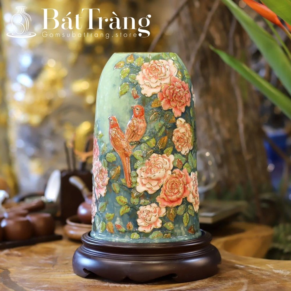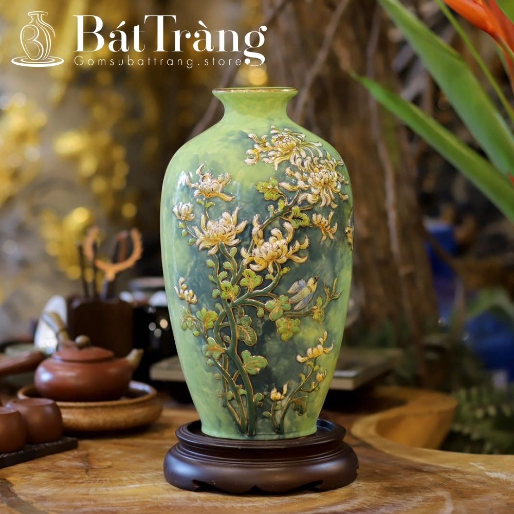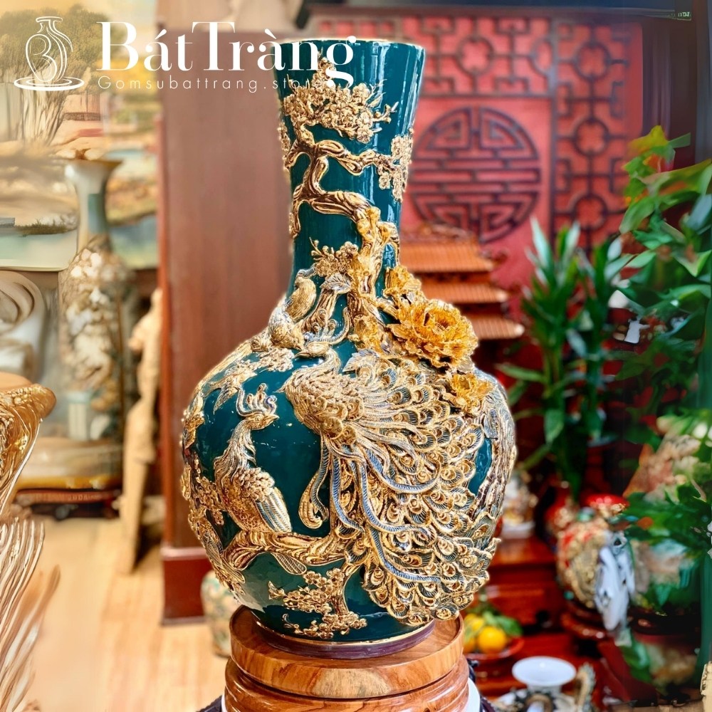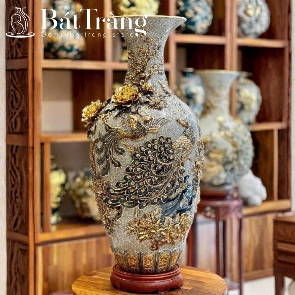 - Dành cho không gian sang trọng, cổ điển: Các mẫu bình men rạn cổ hoặc men màu đắp nổi công phu với các họa tiết như Công Đào, Tứ Quý, hoa Phù Dung sẽ là lựa chọn lý tưởng. Những chiếc bình này không chỉ đẹp mà còn mang ý nghĩa phong thủy tốt lành, chúc gia chủ phú quý, viên mãn.