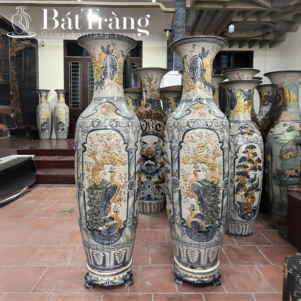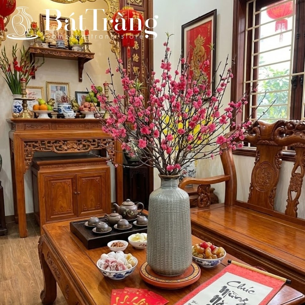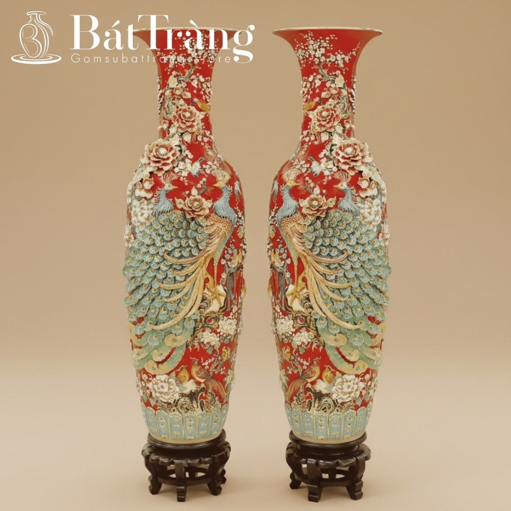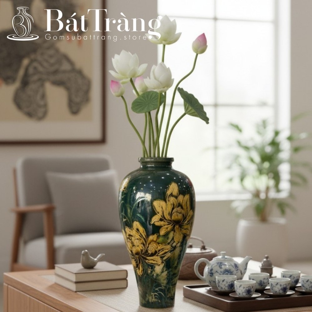 - Dành cho không gian sang trọng, cổ điển: Các mẫu bình men rạn cổ hoặc men màu đắp nổi công phu với các họa tiết như Công Đào, Tứ Quý, hoa Phù Dung sẽ là lựa chọn lý tưởng. Những chiếc bình này không chỉ đẹp mà còn mang ý nghĩa phong thủy tốt lành, chúc gia chủ phú quý, viên mãn.
