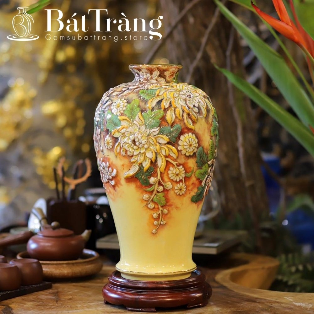 Bình hoa Bát Tràng hoa văn nổi vẽ vàng quà tặng tân gia sang trọng